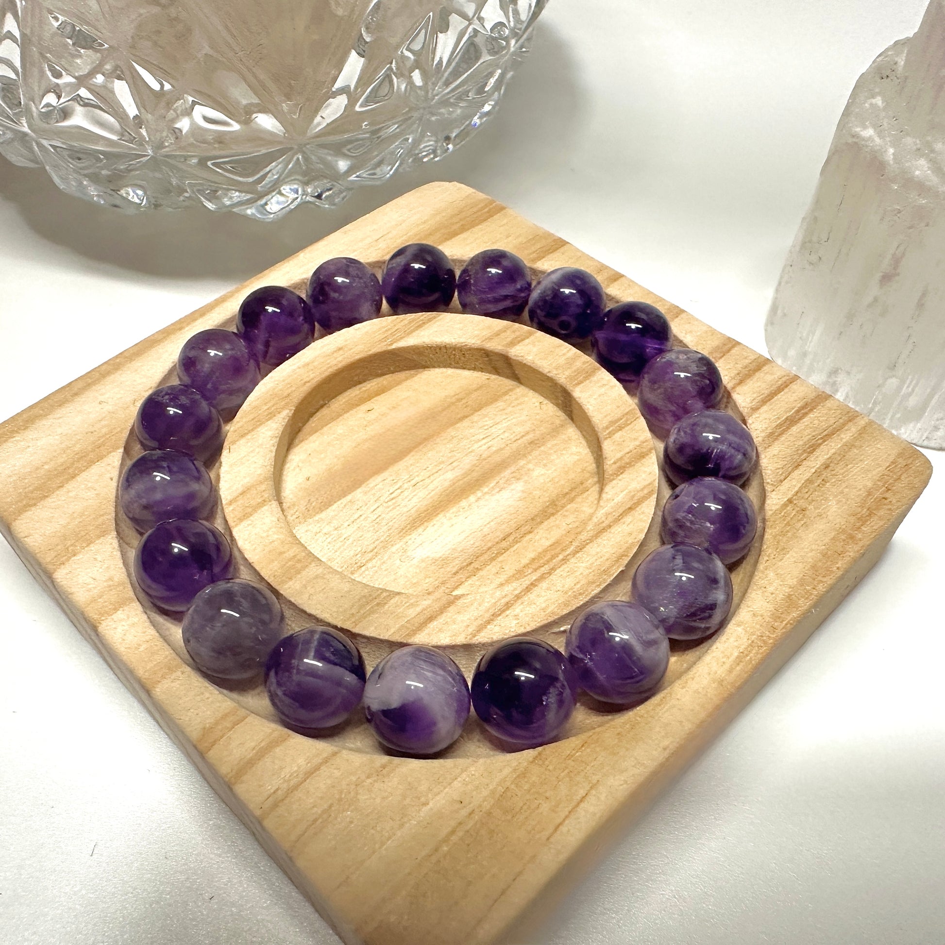 Each bracelet is handmade with genuine Dream Flower Amethyst beads, polished to highlight their natural floral-like inclusions. Every piece is cleansed, charged, and blessed before shipping, making it a unique ally for harmony and inner balance.