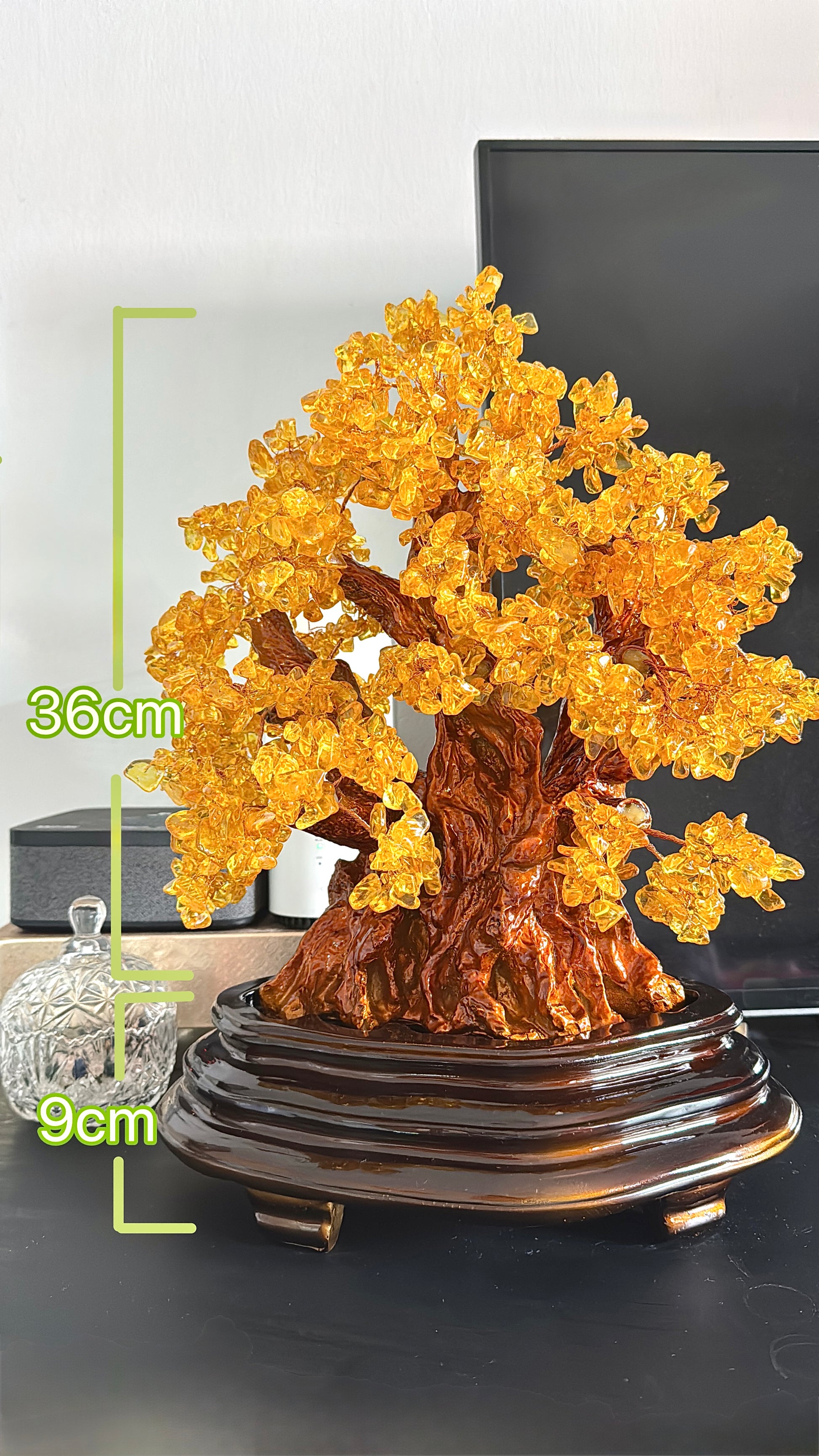 Every detail of this handmade tree is purposeful: the sturdy trunk represents resilience, while the golden-crystal branches spread outward in all directions, reflecting limitless opportunities for wealth and growth.